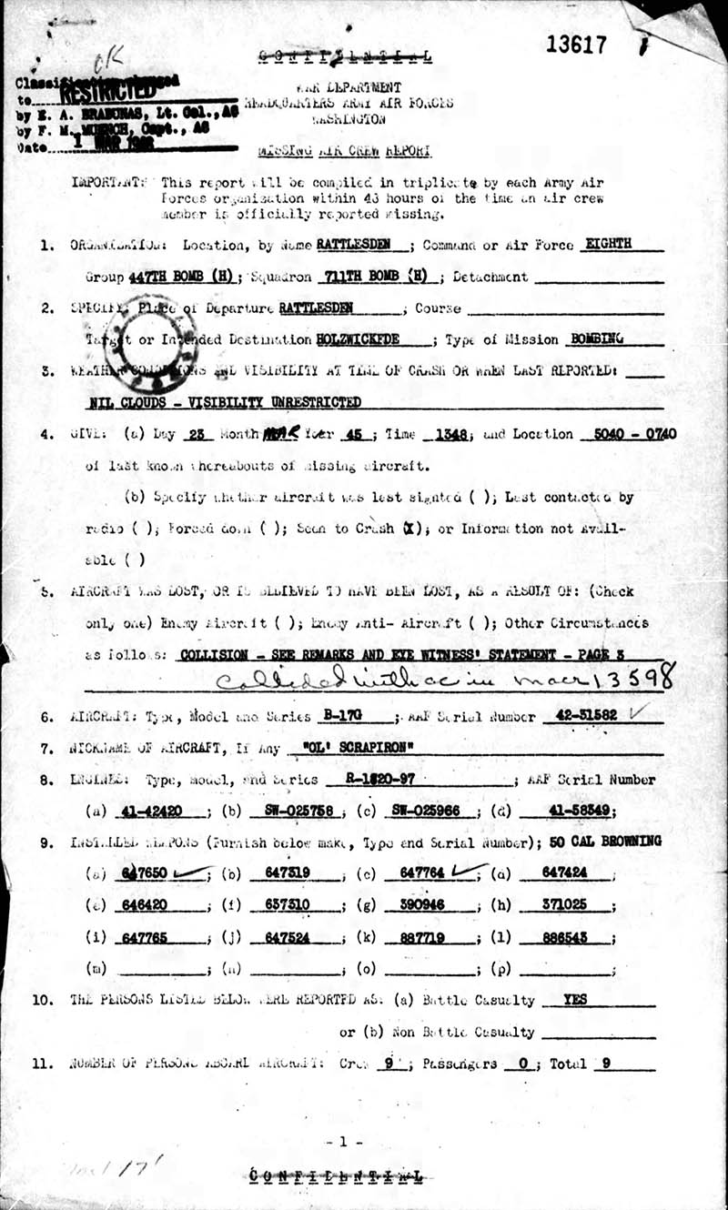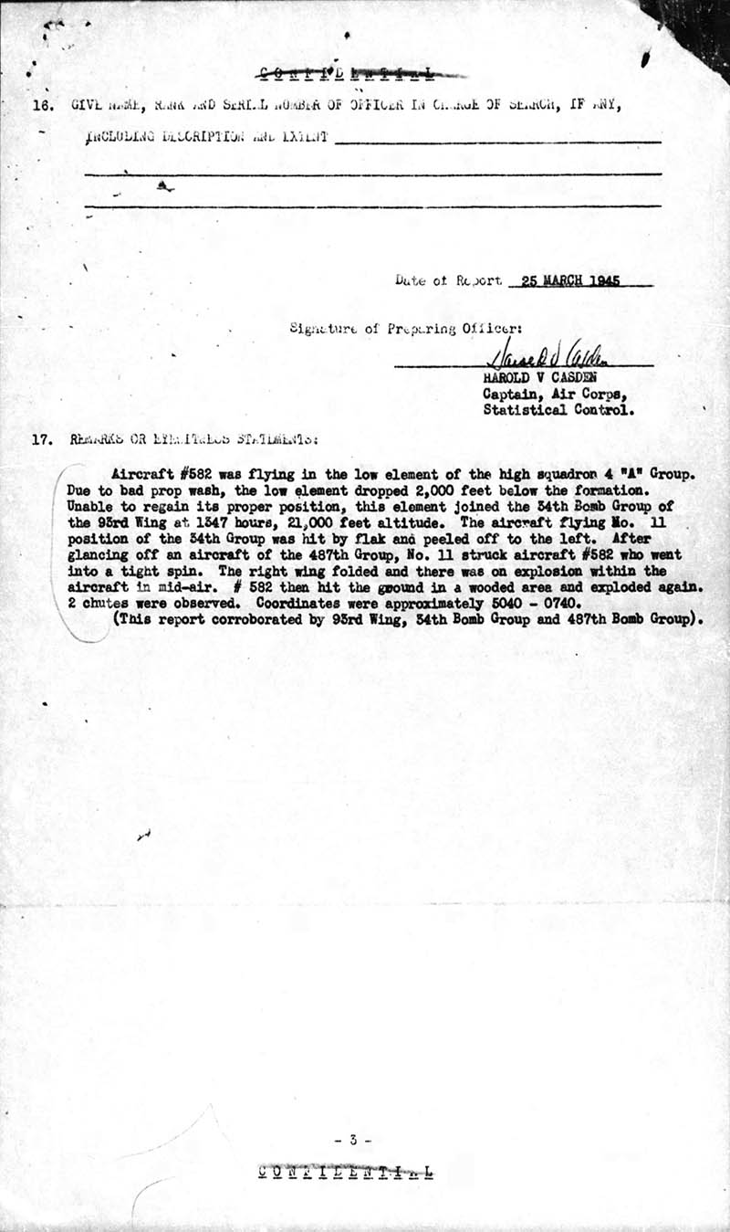 On April 29, 1944, Lt. Robert C. Stevenson was killed on his first mission en route to Berlin, Germany, with Lt. E. D. Johnson in A/C #501 [42-97501] as Co-pilot. Our group lost ten aircraft and one ditched in the North Sea for a total of eleven B-17s lost. Lt. Stevenson was a very mild mannered, easy going person. One evening a group of officers were out on the town having a good time when a bunch of rowdies started to hassle them. Lt. Stevenson was being pushed around, so the story goes, and when he had enough, he single-handedly cleaned house. Problem solved. So our officers called him "Ol' Scrapiron." When Lt. Dahlgran, our original Co-pilot, became Command Pilot he asked for his original crew back. We flew in A/C #42-31582, thus the name "Ol' Scrapiron" was voted by the entire crew. God Bless Lt. Robert C. Stevenson! I, Jack D. Keller, flew only eight missions with Lt. Dahlgran as Command Pilot: six in 582, one in 803, and one in 572. It was sure nice to be back with Lt. Dahlgran.