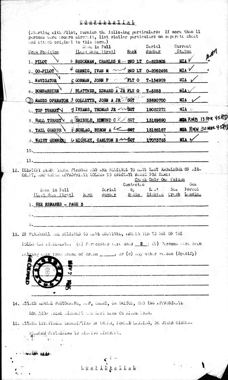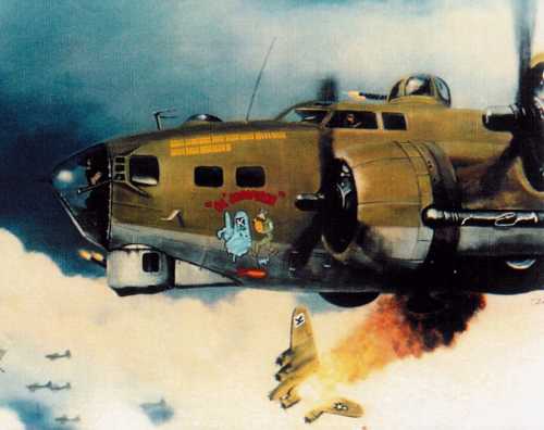 On April 29, 1944, Lt. Robert C. Stevenson was killed on his first mission en route to Berlin, Germany, with Lt. E. D. Johnson in A/C #501 [42-97501] as Co-pilot. Our group lost ten aircraft and one ditched in the North Sea for a total of eleven B-17s lost. Lt. Stevenson was a very mild mannered, easy going person. One evening a group of officers were out on the town having a good time when a bunch of rowdies started to hassle them. Lt. Stevenson was being pushed around, so the story goes, and when he had enough, he single-handedly cleaned house. Problem solved. So our officers called him "Ol' Scrapiron." When Lt. Dahlgran, our original Co-pilot, became Command Pilot he asked for his original crew back. We flew in A/C #42-31582, thus the name "Ol' Scrapiron" was voted by the entire crew. God Bless Lt. Robert C. Stevenson! I, Jack D. Keller, flew only eight missions with Lt. Dahlgran as Command Pilot: six in 582, one in 803, and one in 572. It was sure nice to be back with Lt. Dahlgran.