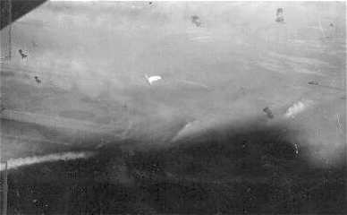 ![]() Amid flak bursts, Dear M.O.M. is seen going down in flames Photo from Harley Tuck's collection |