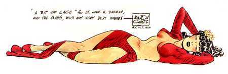 Co-pilot Lt. John Bauman had known artist and cartoonist Milton Caniff from college. Caniff provided the the artwork, copied by Nick Fingelly onto the nose of the plane.