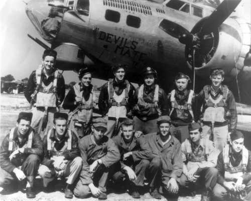 to right, Standing: Sgt Dale J Kelly, LWG Lt. Gumpert, B (repl) Lt. John R. O'Green, N Lt. Myles W. Farson, P Lt. Loyal A. Willis, CP Sgt David O. Monroe Sr, RWG Kneeling: Sgt Charles F. Smith, ENG Sgt Wesley R McDaniel, TG William L. Sturgeon, Ground crew Arthur Kuhnz, Ground Crew Clarence E. Shelton, Ground Crew Sgt Isaac H. Tarver, BTG Sgt Doyle F. Scott, ROG Photo date unknown |