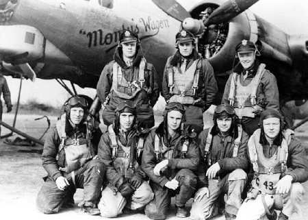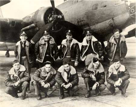 Aaberg crew, 711th Rattlesden, Feb 44 Standing L-R: Lt Irving Danzig Lt Ellis B. Colvin Lt Clarence Aaberg Lt Thomas F. Moriarty S/Sgt Richard Pitt Kneeling L-R: Sgt W.F. Powell Sgt C. Lamb Sgt F. DuHadway Sgt G.S. Foster S/Sgt W.D. Ernst |