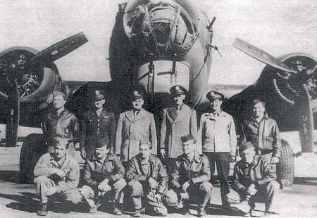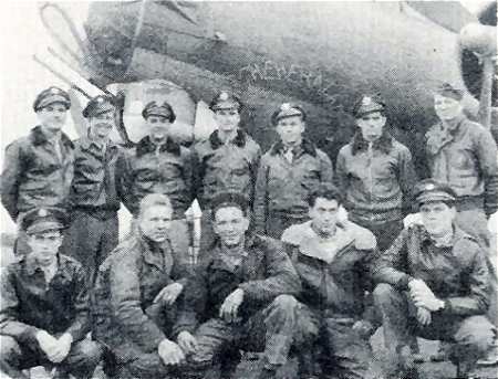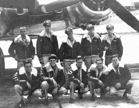 George Hughes crew, 708th Unknown US location, undated Standing, L-R: Sgt Maynard J. Smith Sgt Summer S. Stacy S/Sgt Marion L. Cherry S/Sgt David Portnoy Sgt Louis J. Savarino Sgt Lewis W. Dumond Kneeling, L-R: Lt George L. Betker Lt Francis C. Prendergast Lt George W. Phillips Lt George G. Hughes (Lt Hughes was killed on his combat orientation flight; Lt Phillips became 1st Pilot for this crew.) |