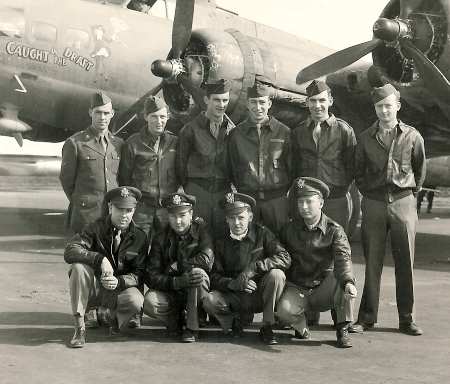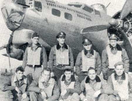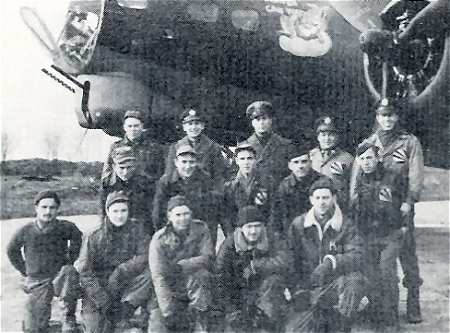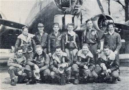 Hysong crew, 708th Rattlesden, undated Standing, L-R: Lt Charlie McQuade Lt Lidge Williams Lt Alexander Sabo Lt James Hysong Kneeling, L-R: Sgt Lloyd Hall Sgt James Fenstermaker Sgt Arthur Knutson Sgt James Coatney Sgt Earl Morrison Combat Diary- Lloyd Hall |