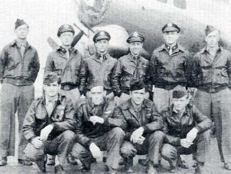 Peters crew, 708th Rattlesden, undated Standing, L-R: Sgt. William Cannon Lt. Donald Peters Lt. Jesse Sandlin Lt. Alfred Rosenfeld Lt. Andrew Cusick Sgt. Alexander Hardie Kneeling, L-R: Ground Crew (unknown) Sgt. Joe Jamison Sgt. Harry Ivans Ground Crew (unknown) Sgt. Joe LaMendola Sgt. Ralph Johnson Ground Crew (unknown) Crew Profile- Peters |