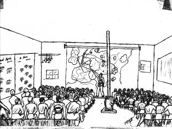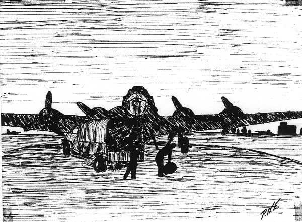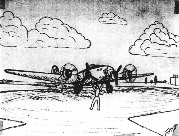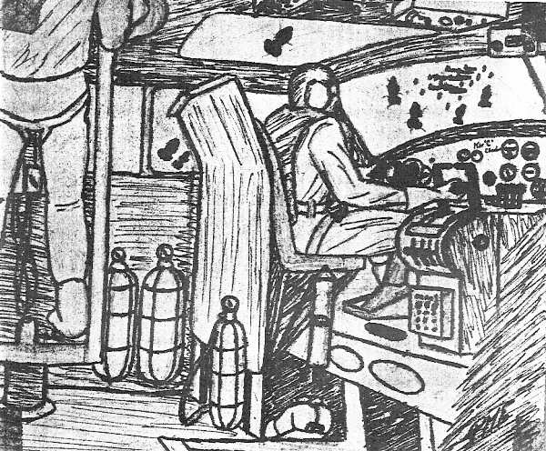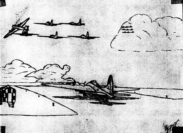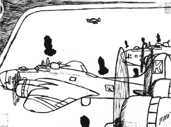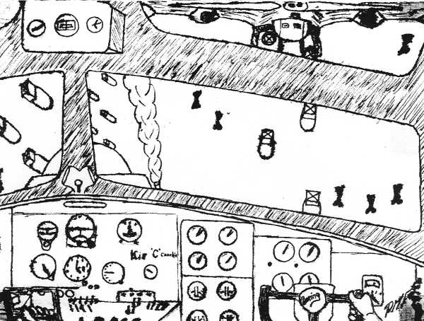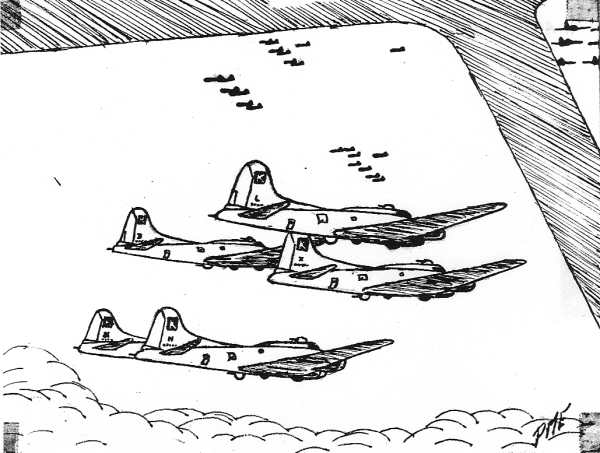 Provided by Mr. Pete Ebersole and Mr. Keith Hardie Lt Pete Ebersole arrived at Rattlesden on December 22, 1944 as copilot of the Coleman crew (709th). His sketches below illustrate one of his combat missions. Note that the two sketches of the cockpit of the B-17 include "Kir C Charlie" marked on the instrument panel -- suggesting the flight (or flights) flown in 43-37667 "Barbara Jane," assigned to the 709th, and known to have carried the tail letter "C" from the fall of 1944 until it crashed in the UK on a training flight in April, 1945. |