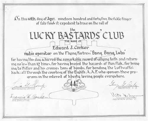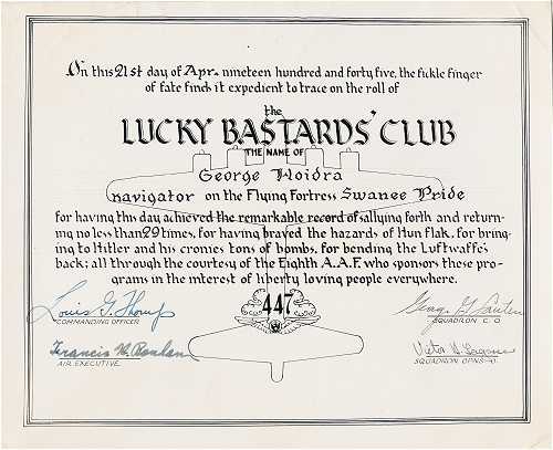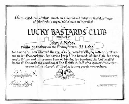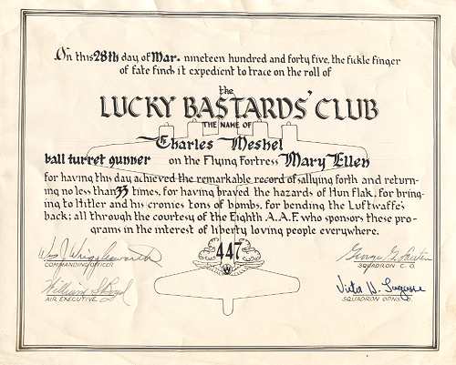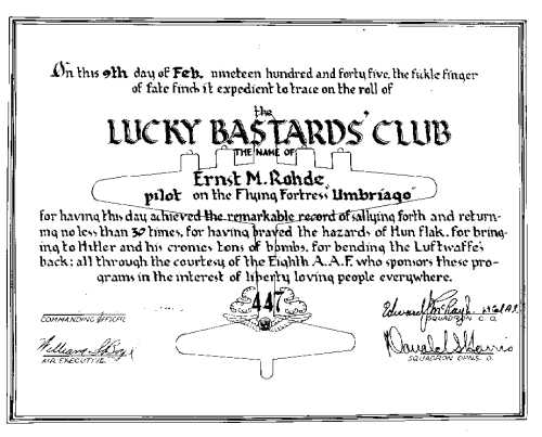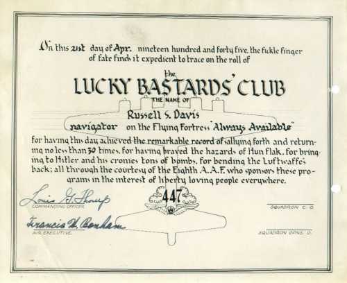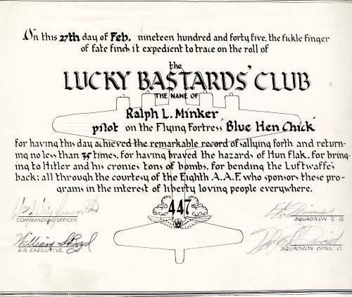 | This is a collection of Lucky Bastards Club certificates provided by members of the 447th. The certificates were issued to combat crewmen upon completion of their tour of duty. Surviving certificates vary greatly in the condition of the original, and the quality of the images provided. |