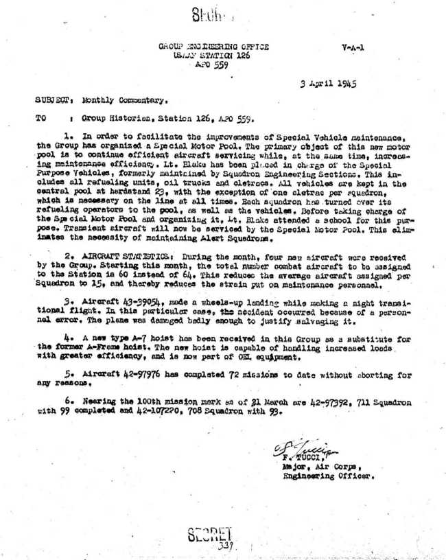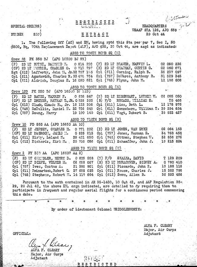 | 11/44 - 05/45 | 710th Squadron, Rattlesden, UK Special Order No. 259 |