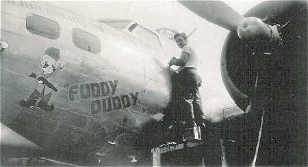 Fuddy Duddy No. 42-97400, a B-17G-45-BO, was built in Boeing’s Seattle plant and delivered to the USAAF on 26 February 1944, and ferried to England in early April. It was assigned to the 708th Squadron on April 7, and began flying combat missions before the month ended. |