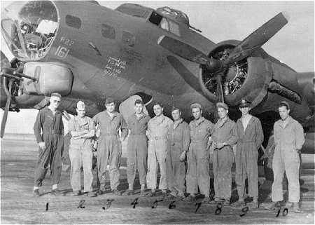 Hysong crew, 708th Rattlesden, undated Standing, L-R: Lt Charlie McQuade Lt Lidge Williams Lt Alexander Sabo Lt James Hysong Kneeling, L-R: Sgt Lloyd Hall Sgt James Fenstermaker Sgt Arthur Knutson Sgt James Coatney Sgt Earl Morrison Combat Diary- Lloyd Hall |