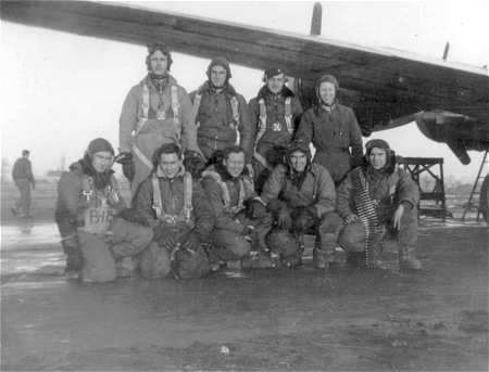 711th Rattlesden, June 1944 Standing, L-R: Sgt Dale Menzel Lt Roland Mitchell Lt Roderick Moe Lt James Liakos Lt William McRoberts Sgt Jack Heath Kneeling, L-R: Sgt Eric Holmes Sgt Dale Stillwell Sgt Reynolds Perez Sgt James Casey |